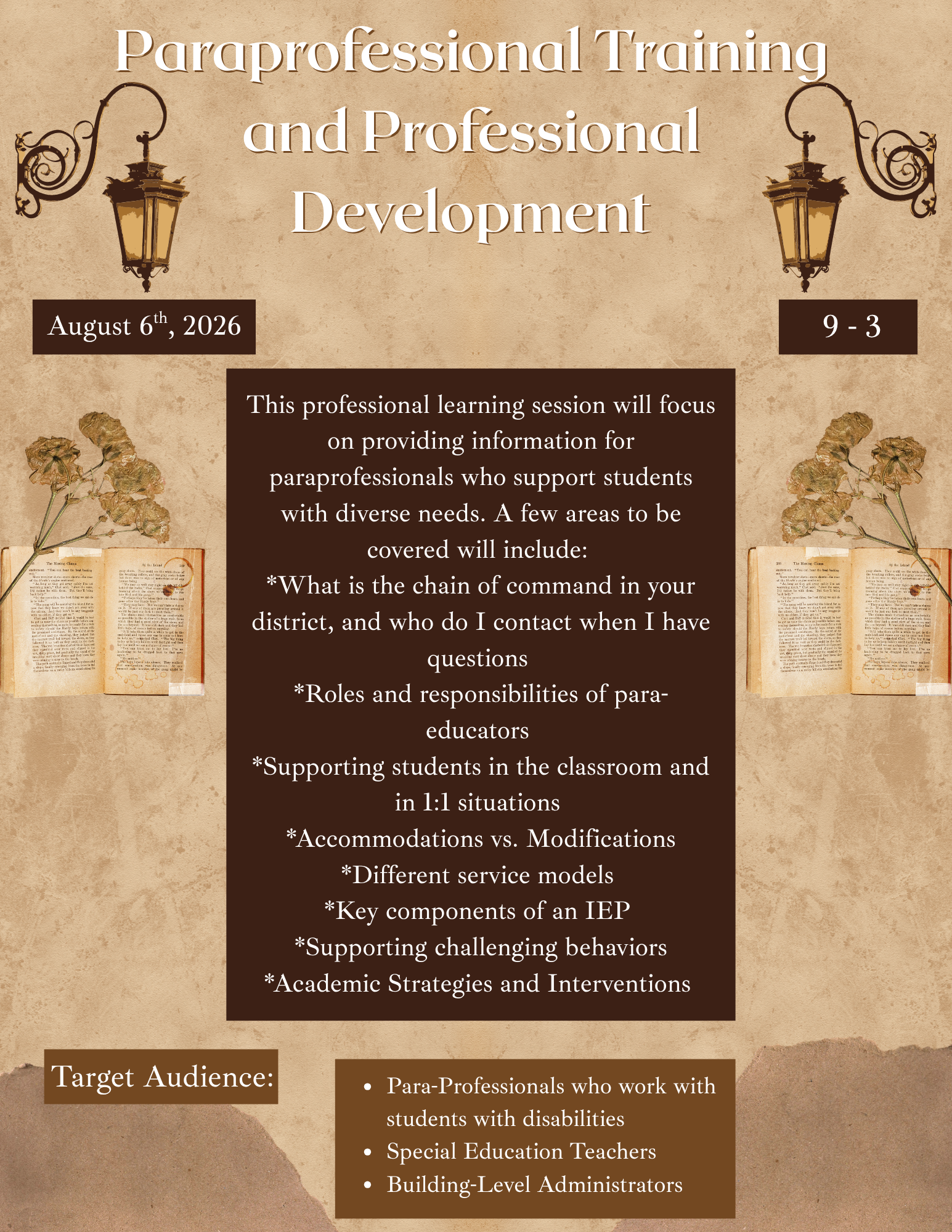 This professional learning session will focus on providing information for paraprofessionals who support students with diverse needs.