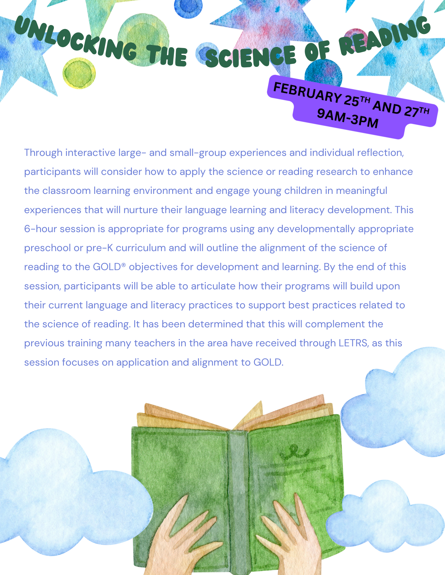 Through interactive large- and small-group experiences and individual reflection, participants will consider how to apply the science or reading research to enhance the classroom learning environment and engage young children in meaningful experiences that will nurture their language learning and literacy development. This 6-hour session is appropriate for programs using any developmentally appropriate preschool or pre-K curriculum and will outline the alignment of the science of reading to the GOLD® objectives for development and learning. By the end of this session, participants will be able to articulate how their programs will build upon their current language and literacy practices to support best practices related to the science of reading. It has been determined that this will complement the previous training many teachers in the area have received through LETRS, as this session focuses on application and alignment to GOLD.